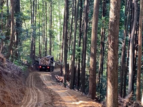 ヨキ林業は長伐期多間伐施業を基本として 山主さんと長期間に渡る管理受託契約を結び 間伐のための作業道作設と5〜10年毎の間伐を行い、間伐材の売り上げの一部を山主さんにお返ししています。